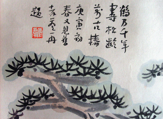 独坐小亭听鹤鸣。孝萱拙笔。鹤乃千年寿,松龄千古椿。庚寅初春又见旧。孝萱再题。(有合照)